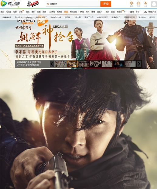 5일 홍보사 블리스미디어는 “KBS 2TV 수목드라마 ‘조선총잡이’가 중국 최대 인터넷 사업자 텐센트의 영상 플랫폼인 QQ사이트에서 7월 한 달간 1억1000만건의 누적 뷰를 기록해 사이트 내 한국 드라마 순위 1위를 기록하고 있다”고 밝혔다.