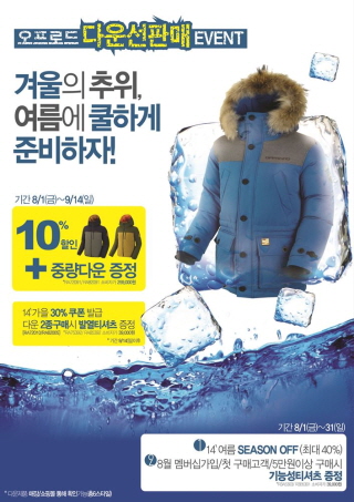 오프로드는 다음달 14일까지 2014 신상품 다운점퍼 선판매 이벤트를 실시한다. 판매되는 제품은 고급 덕다운으로 캠핑 라인 4종, 트레블 라인 2종 등 총 6종이다. 발수 소재를 사용해 겨울철 눈, 비에도 걱정 없도록 내한성을 높였으며 체열반사 안감을 사용해 열손실을 최소화한 것이 특징이다.