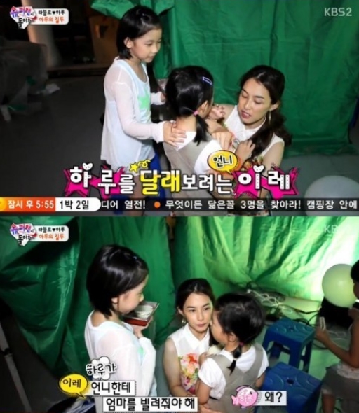 이하루는 10일 방송된 KBS2 예능 프로그램 ‘해피선데이-슈퍼맨이 돌아왔다’에서 아빠 타블로(에픽하이)와 함께 엄마의 영화 촬영현장을 찾았다. 강혜정은 ‘개를 훔치는 완벽한 방법’을 촬영 중이다.