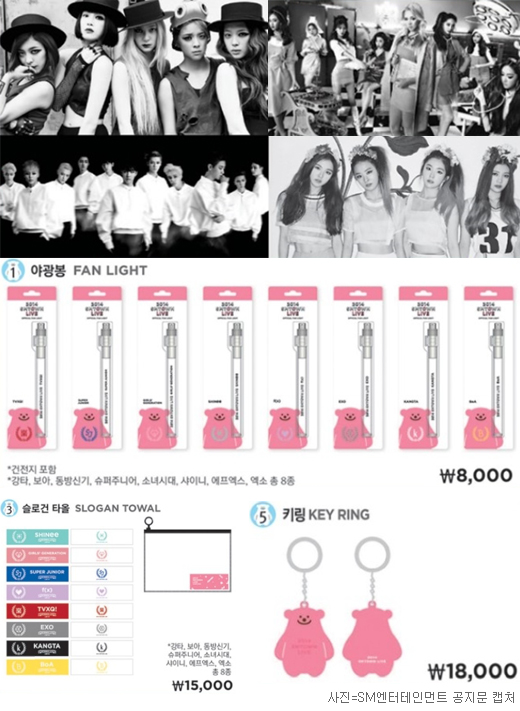 15일 서울 상암월드컵경기장에서는 ‘SM타운 라이브 월드투어 콘서트’가 열립니다. SM엔터테인먼트 소속 가수들이 총출동하는 합동공연이죠. 이런 큰 공연에는 주최 측이 응원도구나 기념품을 특별히 제작하기도 합니다. 이번 공연도 그렇습니다. 야광봉을 비롯해 다양한 공식물품을 판매합니다.