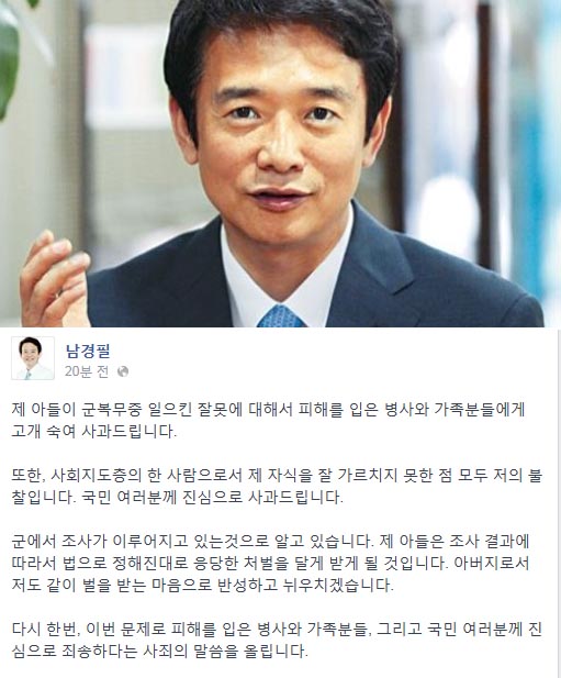 그는 “제 아들이 군복무중 일으킨 잘못에 대해서 피해를 입은 병사와 가족분들에게 고개 숙여 사과드린다”며 “사회지도층의 한 사람으로서 제 자식을 잘 가르치지 못한 점 모두 저의 불찰이다. 국민 여러분께 진심으로 사과드린다”고 밝혔다. 남 지사는 이어 “제 아들은 조사 결과에 따라서 응당한 처벌을 달게 받게 될 것”이라며 “아버지로서 저도 같이 벌을 받는 마음으로 반성하고 뉘우치겠다”고 말했다.
