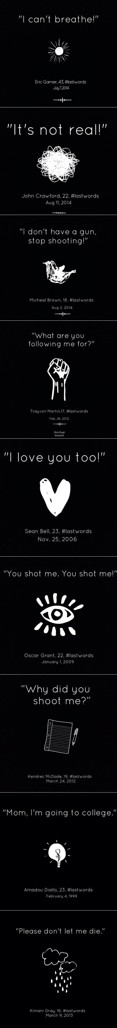 짧은 순간 피해자들이 남긴 비명처럼 짧은 한마디는 인종차별적 행동을 자행하는 미국 공권력을 바늘처럼 찌르고 있는데요. 어떤 말들이 있는지 한 번 보시죠.