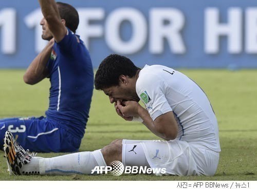 수아레스는 2014 브라질월드컵 조별리그 3차전에서 이탈리아의 수비수 조르조 키엘리니(유벤투스)의 어깨를 물어 국제축구연맹(FIFA)으로부터 대표팀 경기 9차례 출전정지와 4개월 축구활동 금지의 중징계를 받았다.