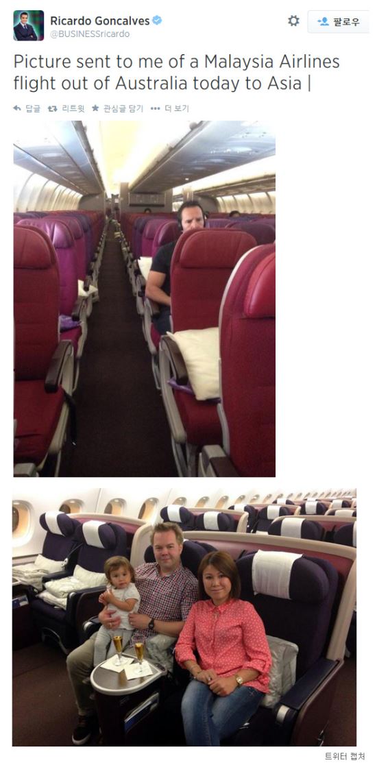 ‘텅텅 빈 채 매일 2백만달러씩 까먹는 말레이시아 항공’이라는 제목 등으로 말이죠. 사진을 보면 수백명이 타고 있어야 할 좌석이 거의 비어 있습니다. 이래서 국내에서도 최근 파격가 할인이 많았나 보군요. 트위터에서는 이 사진들을 놓고 ‘귀신 비행’이라는 댓글이 붙었습니다.