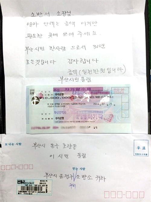 익명의 기부자가 부산소방서에 1000만원짜리 수표를 보내 감동을 주고 있습니다. 인터넷에서는 “눈물 나네” “나라가 해야 할 일을 왜 국민 개인이 할까”라는 댓글이 이어지고 있습니다.