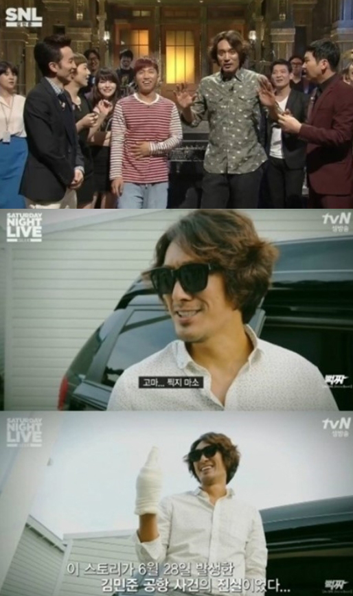 이후 진행된 콩트 ‘뻑짜’에서도 해당 사건을 재치 있게 풀어냈다. 개그맨 정성호에 의해 다섯 손가락 중 중지만 남게 된 김민준은 깁스를 하고 차에서 내리면서 “찍지 마소. 내 손이 이래가”라고 웃으며 말했다.