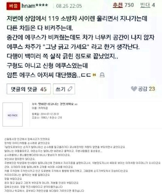 “저번에 상암에서 119 소방차 사이렌 울리면서 지나가는데 다른 차들은 다 비켜주는데, 중간에 에쿠스가 비켜줬는데도 차가 너무 커 공간이 나지 않자 에쿠스 차주가 ‘그냥 긁고 가세요’라고 한 거 생각난다. 다행히 백미러(사이드미러인 듯) 쪽 살짝 긁힌 정도로 끝났었지. 구형도 아니고 신형 에쿠스였는데 암튼 에쿠스 아저씨 대단했음.”