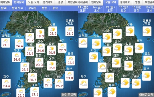 아침 기온은 서울 18.3도, 인천 19.5도, 수원 18.8도, 강릉 15.8도, 대전 17도 등을 기록했으나 일교차가 크게 나겠다. 낮 최고기온은 24~28도로 오르겠다. 기상청은 낮과 밤의 기온차가 10도 안팎으로 커 건강관리에 신경 써야 한다고 당부했다.