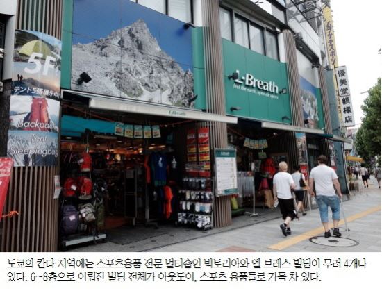 도쿄의 칸다 지역에는 빅토리아와 엘 브레스 빌딩이 무려 4개나 있다. 6~8층으로 이뤄진 빌딩 전체가 아웃도어, 스포츠 용품들로 가득 차 있어 칸다 지역만 가면 일본의 모든 아웃도어 용품들을 구매할 수 있다고 해도 과언이 아니다.