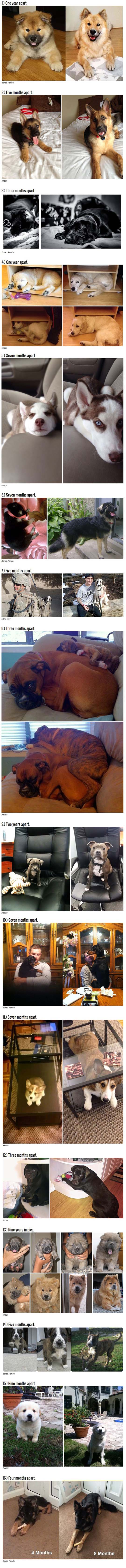 우리는 그러나 개가 얼마나 빨리 자라는지는 잘 알지 못합니다. 매일매일 우리와 함께 있으니까요. 사진으로 보면 개의 성장 속도가 무시무시하다는 걸 알 수 있습니다. 인터넷에는 애완견주들이 개의 성장을 한 눈에 알아볼 수 있게 찍은 사진들이 많습니다. 어떤 개는 1년 만에 훌쩍 성장하기도 하고 어떤 개는 반년 만에 부쩍 크기도 합니다.
