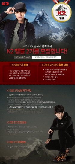 아웃도어 브랜드 K2가 19일부터 28일까지 ‘K2 팸블 2기’를 모집한다. 팸블이란 패밀리 블로거(Family Blogger)의 줄임말로 브랜드 K2를 사랑하는 가족 같은 블로거를 뜻한다.