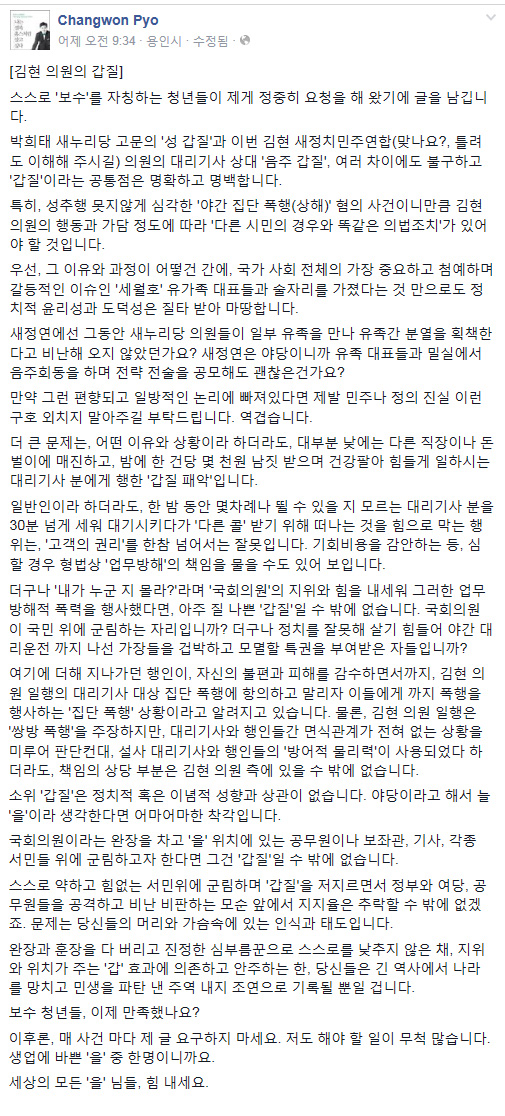 “소위 ‘갑질’은 정치적 혹은 이념적 성향과 상관이 없습니다. 야당이라고 해서 늘 ‘을’이라 생각한다면 어마어마한 착각입니다. 국회의원이라는 완장을 차고 ‘을’ 위치에 있는 공무원이나 보좌관, 기사, 각종 서민들 위에 군림하고자 한다면 그건 ‘갑질’일 수밖에 없습니다.”