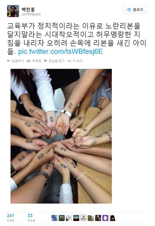 그는 “교육부가 정치적이라는 이유로 노란리본을 달지 말라는 시대착오적이고 허무맹랑한 지침을 내리자 오히려 손목에 리본을 새긴 아이들”이라는 설명과 함께 10여명의 학생들이 손목이나 손등에 세월호 리본을 새긴 것을 내보이는 사진을 첨부했습니다.