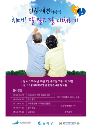 치매에 관심있는 일반인을 대상으로 개최되는 이번 건강강좌는 누구나 참석이 가능하며, 강좌에 대한 자세한 문의는 중앙대병원 대외협력팀(02-6299-219)으로 연락하면 된다.