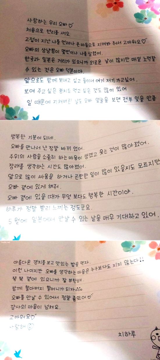 남자친구를 향한 따뜻한 마음이 절절히 느껴지는 내용입니다. 무엇보다 네티즌들을 놀라게 하는 건 내용 보다 한 글자 한 글자 또박또박 적은 치하루씨의 정성 어린 글씨입니다.