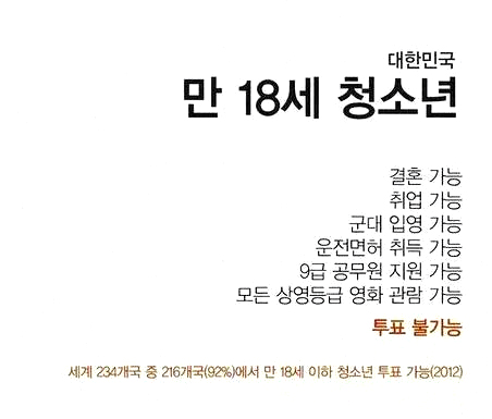 다시 우리 상황을 보시죠. 29일 인터넷에는 ‘대한민국 만 18세 청소년이 할 수 없는 것 한 가지’라는 제목의 사진이 인기를 끌었습니다.
