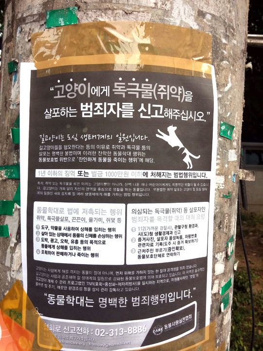 전단지에는 고양이에게 독극물을 살포하는 행위는 동물학대로 1년 이하의 징역 또는 벌금 1000만원 이하에 처해지는 범법행위라고 적혀 있습니다.