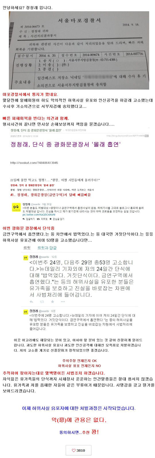글에는 서울마포경찰서가 정 의원에게 보내는 사건처리 결과 통지문이 첨부돼 있네요. 지난 6월20일 정 의원이 고소한 사건과 관련, 경찰이 일간베스트 저장소 A씨에 대해 기소의견으로 서울서부지검에 송치했다는 내용입니다. 정 의원은 형사사건이 마무리되면 민사상 손해보상까지 책임을 묻겠다고도 적었습니다.