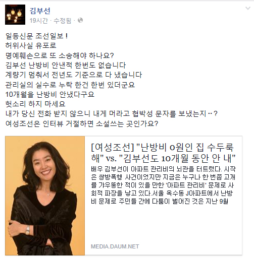 “허위사실 유포로 명예훼손으로 또 소송해야 하나요? 김부선 난방비 안 낸 적 한 번도 없습니다. 계량기 멈춰서 전년도 기준으로 다 냈습니다. 관리실의 실수로 누락 한건 한번 있더군요. 10개월을 난방비 안 냈다구요? 헛소리 하지 마세요. 여성조선은 인터뷰 거절하면 소설 쓰는 곳인가요?”