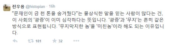 "28일 난데없는 서북청년단 재건 준비위원회의 등장이 우리 사회에 큰 충격을 주고 있습니다. 인터넷 논객들이 앞 다퉈 이를 비판하고 있는데요. 트위터 논객이자 역사학자인 전우용씨가 29일 트위터에서 문재인의 금과 서북청년단 재건을 어떻게 바라봐야할지 분석한 글을 한 번 보시죠.