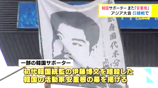 우익 성향 산케이스포츠는 29일 경기장에서 안중근 의사의 초상화가 담긴 대형 그림이 있었다면서 규정 위반 가능성을 제기했습니다.