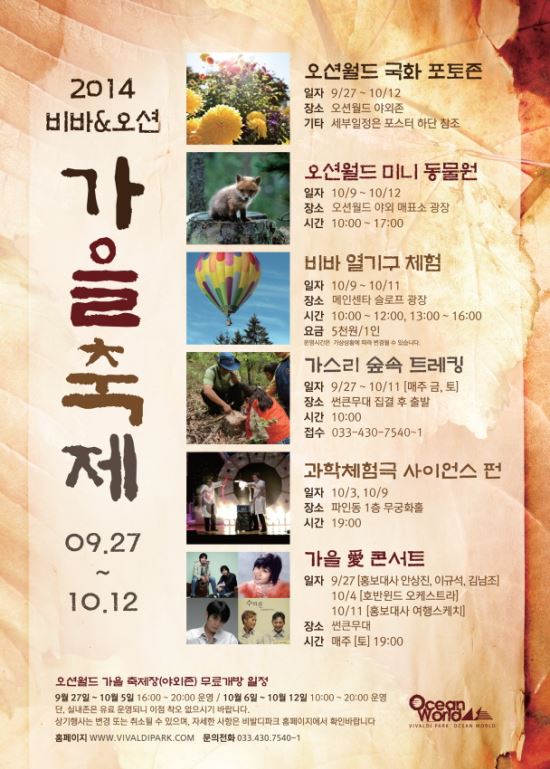 대명리조트는 문화의 달을 맞아 27일부터 10월 12일까지 홍천 비발디파크에서 ‘2014 비바&오션 가을축제’를 개최한다. ‘2014 비바&오션 가을축제’는 △만개한 국화꽃을 보며 가을의 정취를 만끽할 수 있는 국화포토존 △아이들의 동심을 자극하는 미니동물원 △가을 하늘로 날아오르는 열기구 체험 △옛 추억을 떠올리는 ‘가을愛 콘서트’ 등으로 구성됐다. 특히 이번 가을축제에서는 최초로 미니동물원을 오픈해 다양한 볼거리를 제공한다.