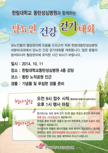 한림대학교동탄성심병원 내분비당뇨갑상선센터는 당뇨병환자와 가족들에게 올바른 당뇨병관리 실천법을 알리기 위해 오는 10월 11일(토) 경기도 화성시 동탄 신도시에 위치한 노작공원 일대에서 ‘2014, 제1회 당뇨인 건강걷기 대회’를 개최한다.