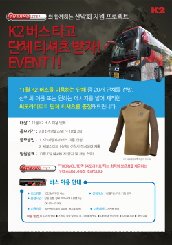 아웃도어 브랜드 K2는 오는 1일부터 다음달 30일 이내에 K2 버스를 이용하는 단체 중 20개 단체를 선발하여 써모라이트 단체 티셔츠를 증정하는 이벤트를 진행한다.
