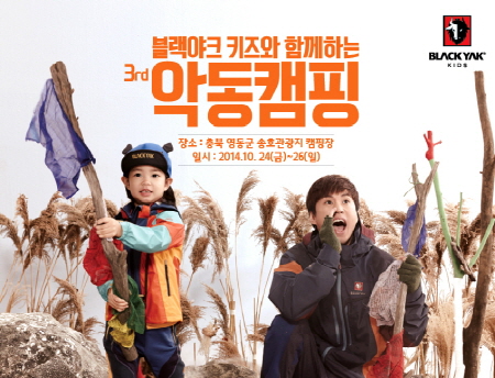 오는 24~26일에 충북 영동군 송호관광지 캠핑장에서 열리는 악동캠핑은 자연 속에서 온 가족이 소중한 추억의 시간을 만들 수 있도록 키즈 아웃도어문화마케팅 일환으로 기획됐다. 행사는 블랙야크 키즈 제품을 입고 사진을 찍을 수 있는 ‘포토 이벤트’를 비롯해 ‘패밀리룩을 찾아라’, ‘요리대회’ 등