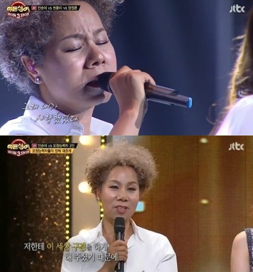 인순이는 11일 방송된 jtbc ‘히든싱어3’에서 다섯 명의 모창능력자들과 대결을 펼쳤다. ‘밤이면 밤마다’ ‘거위의 꿈’ ‘친구여’ 등 히트곡들이 차례로 선곡됐다. 각 라운드를 무사히 통과한 인순이는 마지막 4라운드에서 ‘아버지’를 불렀다.