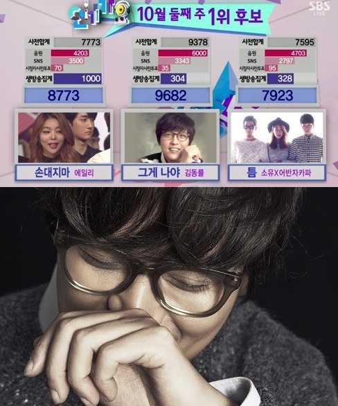 김동률은 12일 방송된 SBS ‘인기가요’에서 6집 동행의 타이틀곡 ‘그게 나야’로 1위를 차지했다. 후배가수 에일리의 ‘손대지마’와 소유X어반자카파의 ‘틈’이 후보에 함께 올랐다. 현재 높은 인기를 구가하고 있는 팀들이었다. 하지만 트로피는 무대에 서지도 않은 김동률에게 돌아갔다. 점수차도 크게 났다.