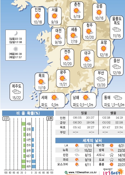 제19호 태풍 ‘봉퐁(VONGFONG)’은 일본 열도로 물러갔지만 한반도엔 추위가 찾아왔다. 14일 전국의 아침 최저기온이 10도 안팎의 낮은 기온을 기록했다.