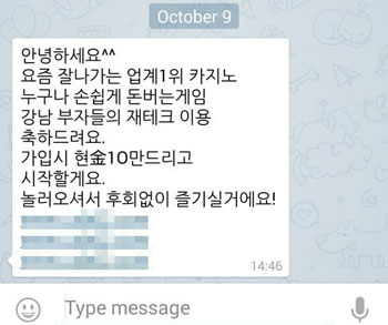“안녕하세요. 요즘 잘나가는 업계 1위 카지노. 누구나 손쉽게 돈버는 게임. 강남 부자들의 재테크. 가입하면 현금 10만원 지급하고 시작….”