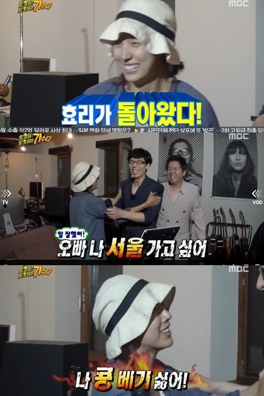 세 사람은 집 안에 마련된 작업실에서 핑클 노래를 부르기 시작했다. 첫 곡 ‘나우’를 부를 때 이효리는 약간 어색해했으나 점점 목이 풀렸다. ‘영원한 사랑’을 부르면서 흥이 최고조에 다다랐다. 이효리는 목청껏 노래 부르고 춤추다 문득 유재석에게 “오빠 나 서울 가고 싶어. 콩 베기 싫어”라며 매달렸다.