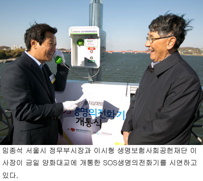 생명보험사회공헌재단은 한국생명의전화와 함께 오늘(12일)에 양화대교에서 11번째 자살예방 긴급상담전화 ‘SOS생명의전화기’ 개통식을 개최했다고 밝혔다.