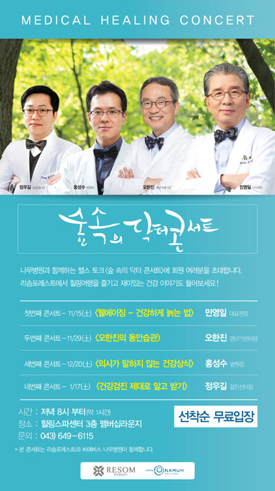 제천에 위치한 리솜포레스트에서는 매월 1~2회 건강 강좌 ‘숲속의 닥터 콘서트’가 열리게 된다. 오는 15일 오후 8시부터 열리는 첫 번째 강의는 ‘웰 에이징 - 건강하게 늙는 법’라는 주제로 민영일 대표원장이 진행한다.