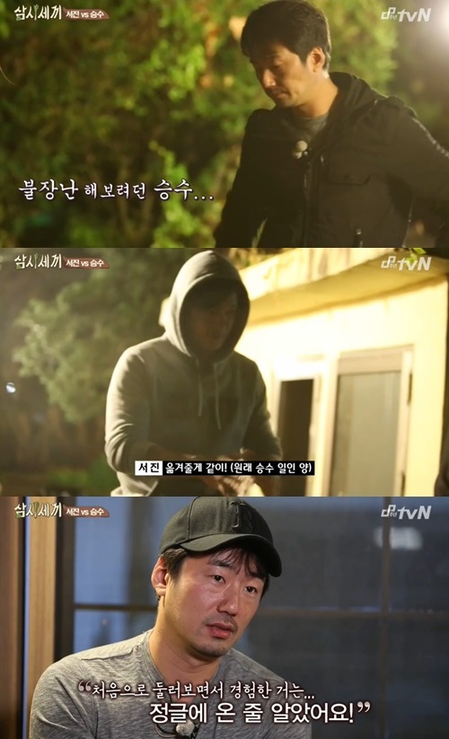등장부터 환영 받지 못했다. 류승수는 14일 방송된 tvN 예능 프로그램 ‘삼시세끼’에서 이서진과 옥택연이 먼저 도착한 집에 깜작 방문했다. 그가 빼꼼 얼굴을 내밀며 마당에 들어서자 이서진은 “그냥 가. 내일 아침에 와”라며 문전박대했다.