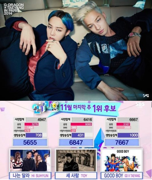 지드래곤과 태양이 함께 내놓은 신곡 ‘굿보이’는 30일 방송된 SBS ‘인기가요’에서 1위를 차지했다. 이날 방송 뿐 아니라 신곡 공개 후 아무런 방송활동을 하지 않았기 때문에 더욱 의미가 있었다.