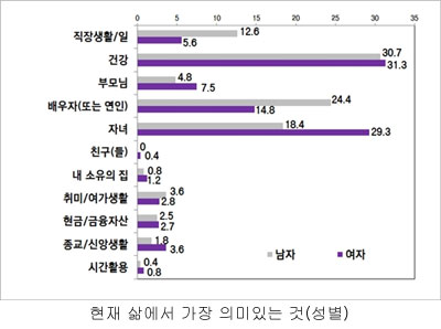 전체 설문자를 대상으로 한 ‘현재 삶에서 가장 의미있는 것’에 대한 질문에는 남녀 모두 ‘건강’이 1위였다. 그러나 건강에 이어 남성은 배우자, 여성은 자녀를 꼽아 차이를 보였다.
