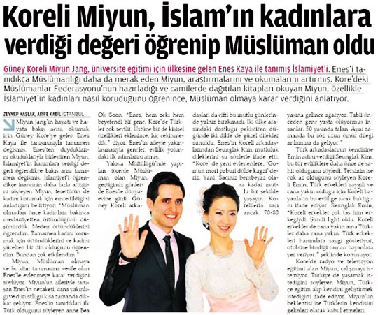 당시 터키 언론은 장씨를 집중 조명했죠. 터키는 헌법상 정치와 종교를 분리했지만 국민의 99%가 무슬림입니다. 그런 터키에서 무슬림의 삶을 선택한 한국인 여성은 신기하면서도 낯선 존재였을 겁니다. 턱시도를 입은 에네스와 웨딩드레스를 입은 장씨의 사진이 신문에 크게 실릴 만큼 두 사람의 결혼은 터키에서 많은 관심을 받았습니다.