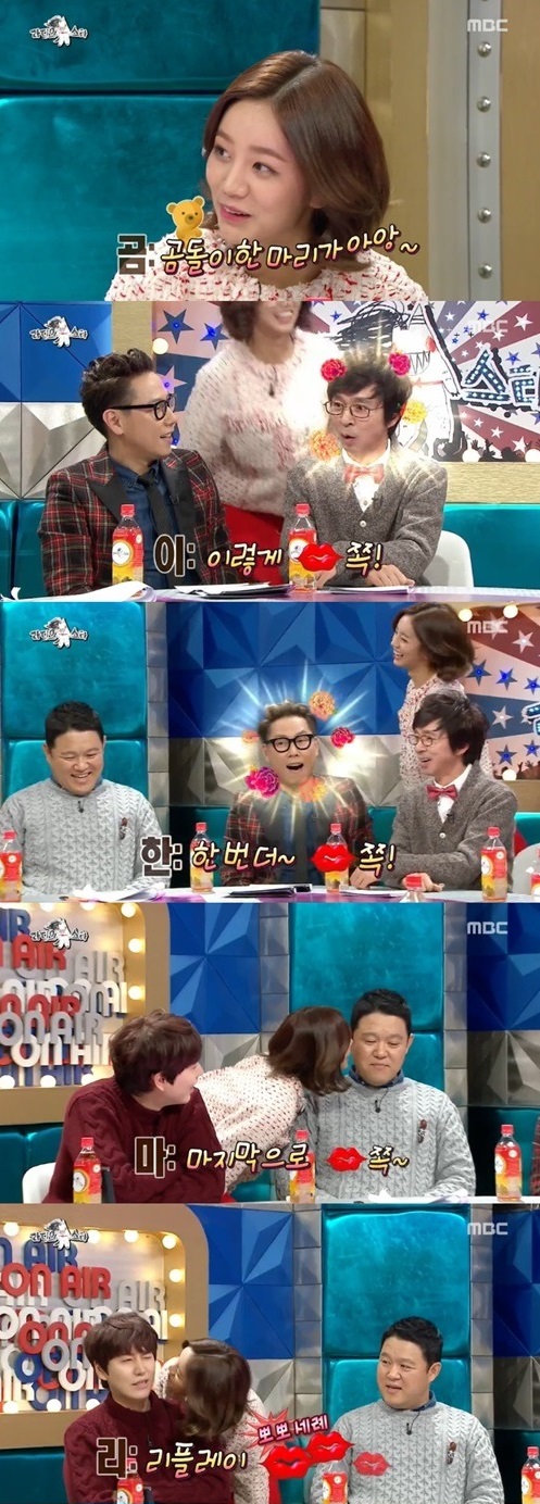 MC들이 ‘곰’이라고 운을 떼자 혜리는 “곰돌이 한 마리가”라고 말하며 자리에서 일어났다. 이어 ‘돌’에는 “돌아다니다가”라면서 김국진 옆으로 향했다. 그리고는 “이렇게”라고 하며 그의 볼에 뽀뽀하는 시늉을 했다. 이어 “한 번 더”라고 하면서 윤종신에게, “마지막으로”라며 김구라에게 뽀뽀하 듯 ‘쪽’ 소리를 냈다. 끝으로 “리플레이”라고 말하며 규현의 볼에도 입술을 가까이 갖다 댔다.