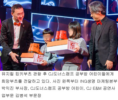 ING생명은 지난 13일 CJ도너스캠프 공부방 어린이들을 초청해 뮤지컬을 관람하고 ‘희망 부츠’ 300켤레를 전달했다고 15일 밝혔다.