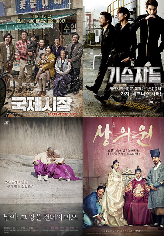 한국영화의 기세에 밀린 할리우드 영화 ‘호빗: 다섯 군대 전투’가 가까스로 4위에 이름을 올렸다. 주말관객 31만1565명(누적관객수 233만8426명)을 모으는데 그쳤다. 순위도 두 계단 내려왔다. 5위는 다시 한국영화 ‘상의원’이 차지했다. 한석규·고수가 주연한 영화는 주말동안 17만8006명을 모아 누적관객 55만1827명을 동원했다.