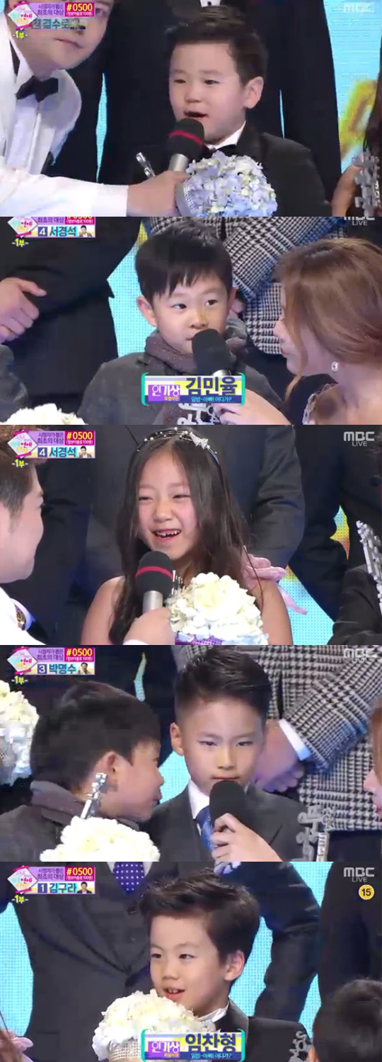 MBC ‘일밤-아빠! 어디가?’의 윤후, 정세윤, 임찬영, 안리환, 김민율이 2014 MBC 연예대상 특별부문 인기상을 공동수상했다.