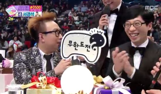 박명수는 앞서 열린 KBS 연예대상에서 유재석이 대상을 수상한 사실을 언급하며 “KBS와 MBC는 다르다. 나는 MBC 성골 개그맨”이라고 힘주어 말했다. 마이크를 넘겨받은 유재석은 아랑곳하지 않고 “(대상이) 받고 싶다고 받는 것도 아니고 양보한다고 양보되는 것도 아니다”라며 “주시면 받겠다”고 받아쳤다.
