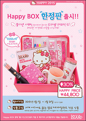글로벌 캐릭터 헬로키티 테마 복합 문화 공간 헬로키티아일랜드가 오픈 1주년을 기념해 2015년 1월 한 달간 해피박스 200개를 한정 판매한다.