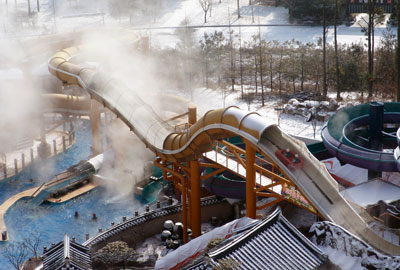충남 덕산의 리솜스파캐슬은 49도의 뜨거운 온천수로 계절에 관계없이 야외물놀이와 스파를 모두 운영하고 있어 겨울 물놀이를 즐기기에 제격이다. 일반 워터파크 시설들이 겨울에는 실내 일부만 오픈하는 것과는 달리 이 곳은 한겨울에도 야외 전시설을 오픈해 온천파도풀과 워터슬라이드까지 모두 이용할 수 있다.
