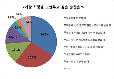 먼저 ‘현재 삶에서의 일탈을 꿈꾸고 있는가’라는 질문에 68.1%의 응답자가 ‘그렇다’고 답했다. ‘가장 직장을 그만 두고 싶은 순간’에 대한 질문에는 응답자 중 가장 많은 비중인 34.1%가 ‘일이 재미가 없을 때’를 꼽았다. 이어 2위 ‘직장 내 인간관계로 스트레스를 받을 때(26.5%)’, 3위 ‘매일 계속되는 야근에 자아가 상실될 때(13.1%)’, 4위 ‘상사가 괜한 히스테리로 트집 잡을 때(12.0%)’ 등의 답변이 있었다. 기타 답변으로는 ‘퇴근하려는데 갑자기 일 시킬 때’, ‘연차 쓰는데 눈치 줄 때’ 등을 꼽았다.