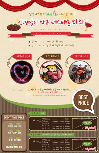 이번 행사에는 일영 허브랜드의 불빛축제 감상과 함께, 버스킹 밴드 세르의 공연과 레크레이션이 함께 즐길 수 있다. 2인기준 치마살과 등심, 와규꼬치와 함께 와인 2잔이 제공된다. 가족이라면 패밀리 세트로 더욱 저렴하게 이용할수 있다.