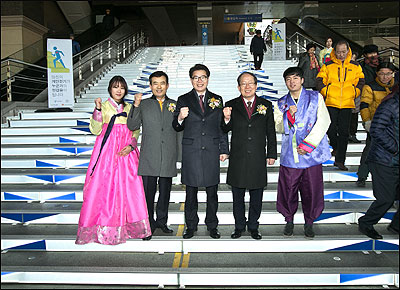 생명보험사회공헌재단과 서울특별시는 8일 10시30분 왕십리역 광장에 건강기부계단을 설치하고 유석쟁 생명보험사회공헌재단 전무, 정원오 성동구 구청장, 조준래 비트플렉스 회장 및 서울시 관계자 등이 참석한 가운데 개통식을 개최했다고 밝혔다.